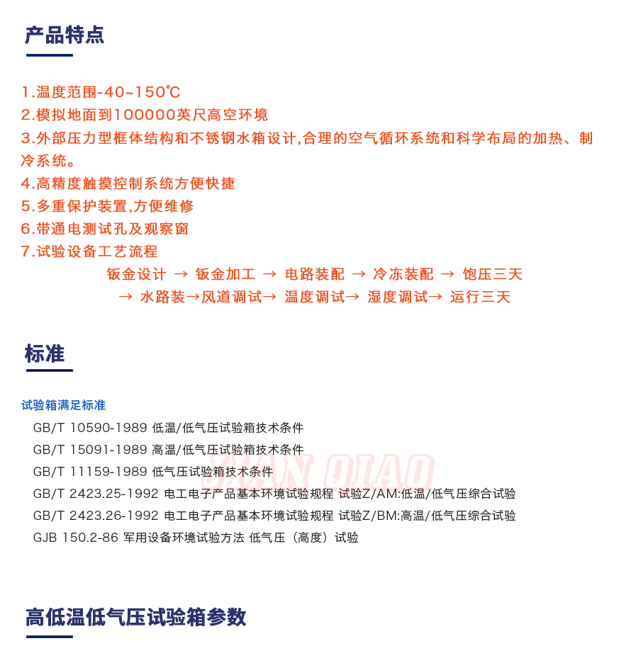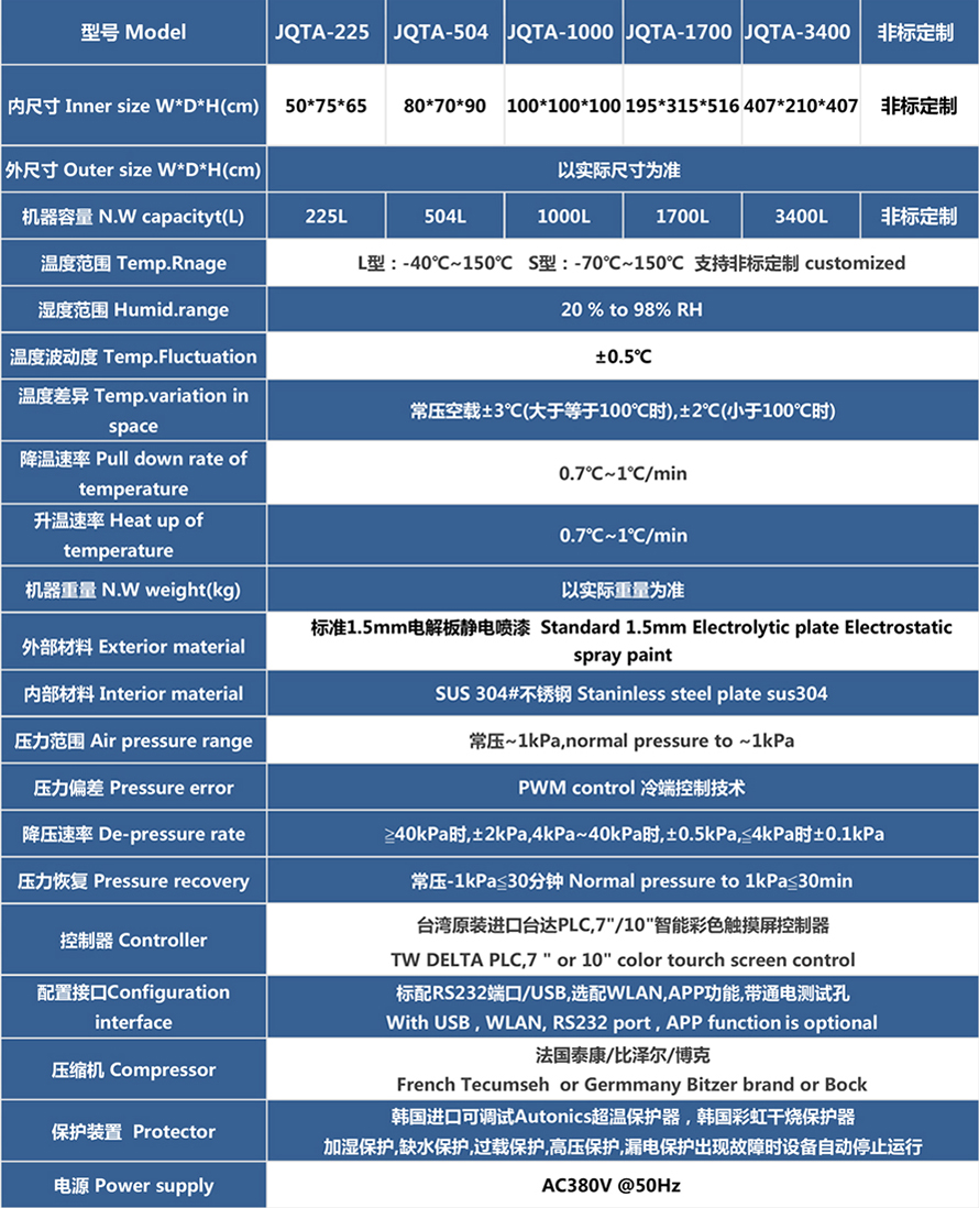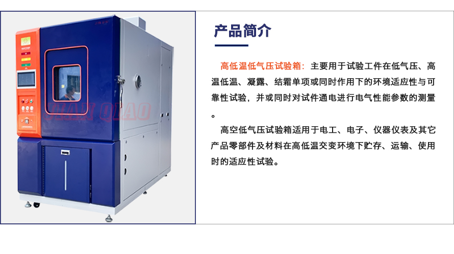 產品型號:JQTA-225 品牌:劍 喬 用途:高低溫低氣壓試驗箱:主要用于試驗工件在低氣壓、高溫低溫、凝露、結霜單項或同時作用下的環境適應性與可靠性試驗,并或同時對試件通電進行電氣性能參數的測量。