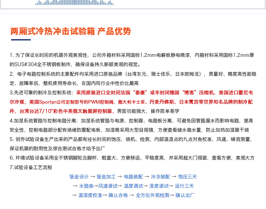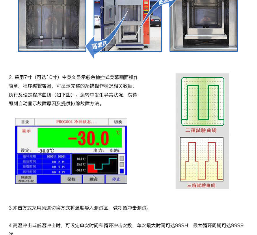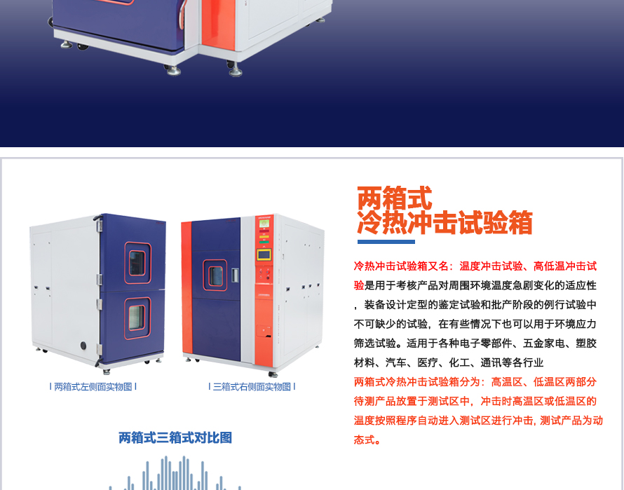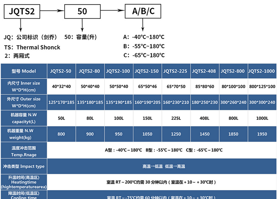 產品型號:JQTS2-408 品牌:劍 喬 用途:兩箱式冷熱沖擊試驗箱又名溫度沖擊試驗箱或高低溫沖擊試驗箱是用于考核產品對周圍環境溫度急劇變化的適應性,裝備設計定型的鑒定試驗和批產階段的例行試驗中不可缺少的